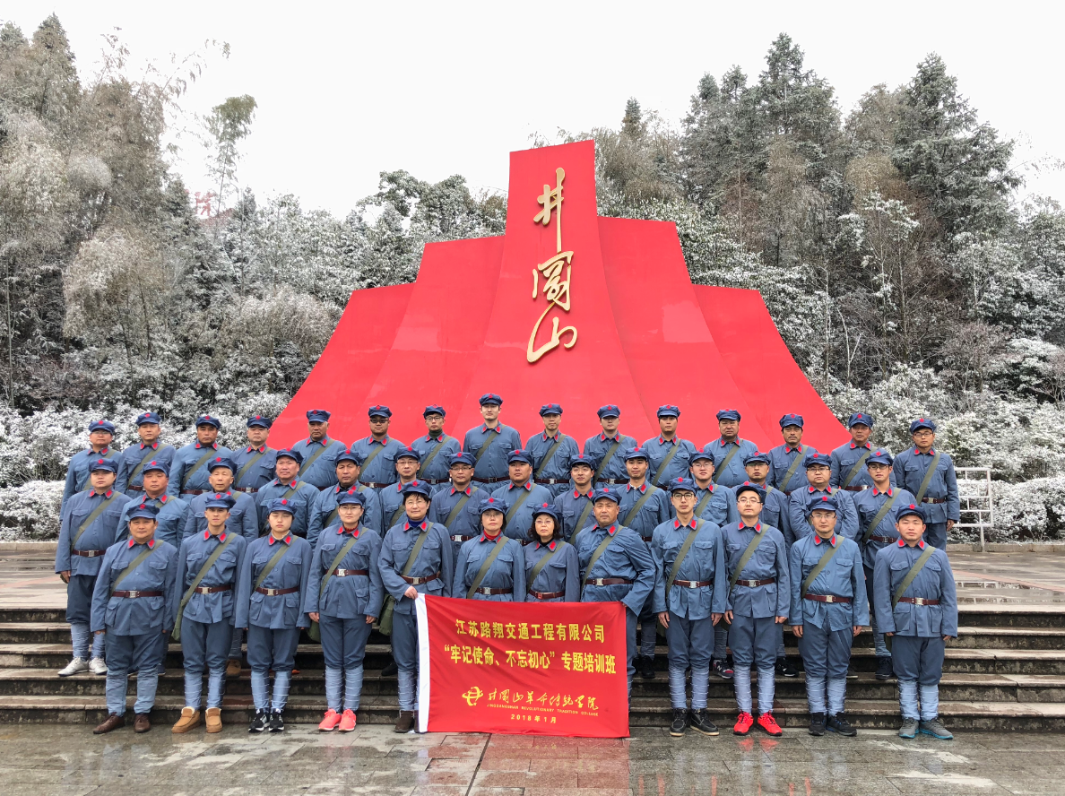 2018年1月26日清晨7時許,天空正飄灑著在一場罕見的鵝毛大雪,地面上也已鋪滿積雪但尚未結(jié)冰,馬路上只有寥寥的幾輛車在緩慢的行駛。而在江蘇路翔交通工程有限公司的大門前,卻是另外一番景象,不斷有從不同方向駛來的車輛進(jìn)入公司,從車上陸續(xù)下來的人都不約而同地拖著一個行李箱,原來是公司即將奔赴井岡山開啟“牢記使命、不忘初心”紅色之旅的伙伴們。7時40分,旅游大巴載著全部41名伙伴正式出發(fā),在風(fēng)雪中開啟了這趟不平凡的培訓(xùn)旅程。
